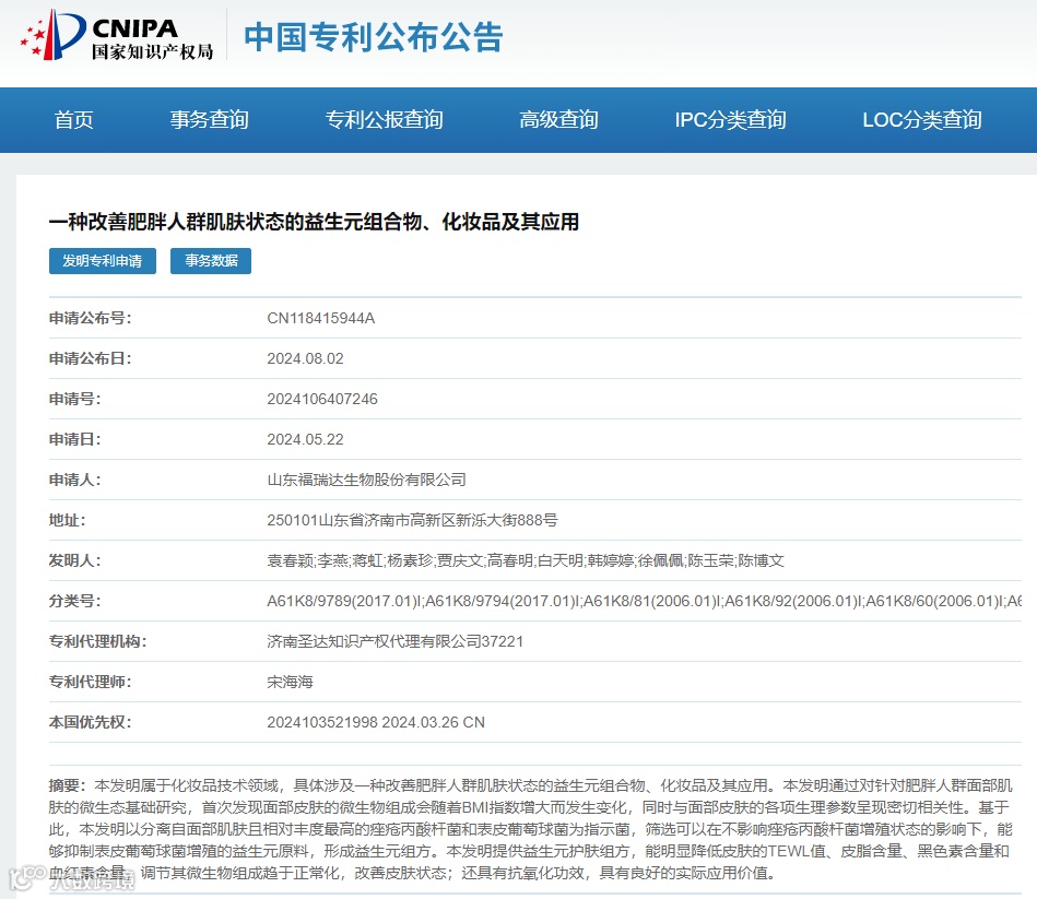 2024年,福瑞达又瞄准了肥胖群体的皮肤微生态,并申请了一项名为“一种改善肥胖人群肌肤状态的益生元组合物、化妆品及其应用(CN118415944A)”的发明专利。