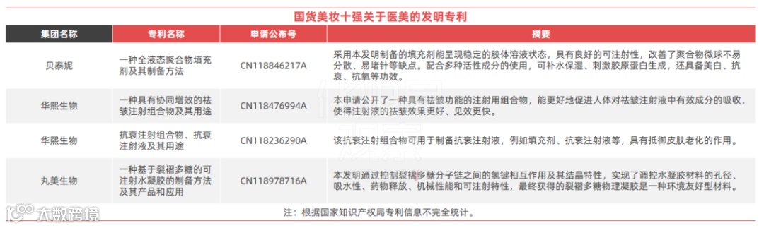 又如丸美生物,申请了一项名为“一种基于裂褶多糖的可注射水凝胶的制备方法及其产品和应用(CN118978716A)”的发明专利,这与其去年公布的“十年战略”相呼应。从“丸美股份”到“丸美生物”,丸美通过更名展示了未来致力于生活美容与医学美容“双美”融合发展的决心,并计划于2026年推出重组胶原蛋白水光针(三类证)医美产品,可见,丸美生物正在为进军医美领域做充足的准备。