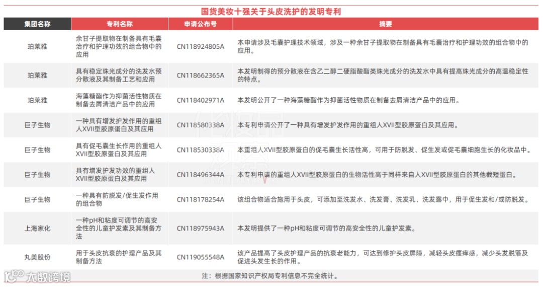2024年12月,丸美生物公开了一项名为“用于头皮抗衰的护理产品及其制备方法(CN119055548A)”的发明专利,该专利可提高头皮护理产品的抗衰老能力,从而达到减少头发脱落及促进头发生长的效果。此前,丸美生物另一项名为“具有头皮抗衰作用的组合物以及口服产品”的发明专利已获得授权,可见,丸美生物已打好了科研地基,为其在头皮洗护领域的竞争增添了新的技术底气。