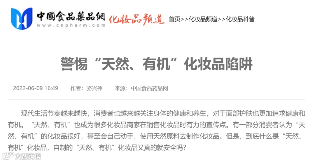 日前(6月9日),中国食品药品网发布了一篇名为《警惕“天然、有机”化妆品陷阱》的科普文。