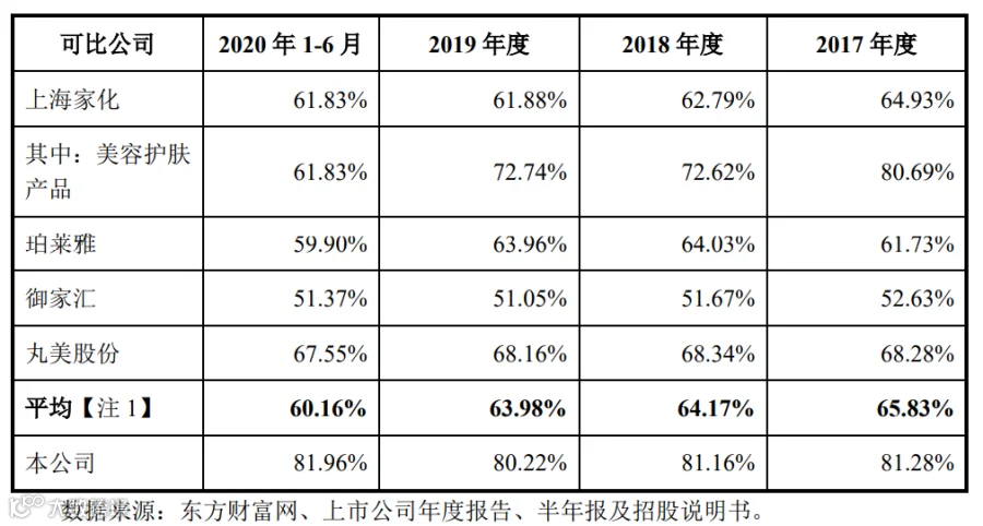 毛利率方面,贝泰妮最高。2017年至2019年,其综合毛利率分别为81.28%、81.16%和80.22%,高于行业65.83%的平均毛利率水平。2020年上半年,其毛利率一度达到81.96%,再创新高。