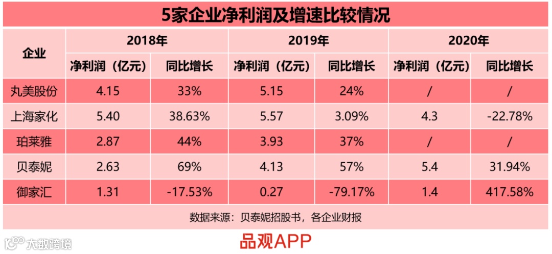 整体而言,贝泰妮近3年来的营收增长实现领先。2018年和2019年,其55%和57%的营收增速,远远领先于其他几大企业。2020年,贝泰妮实现38.49%的增长,这一增速虽然低于同时期的御家汇,但三年来的整体增长高于后者。