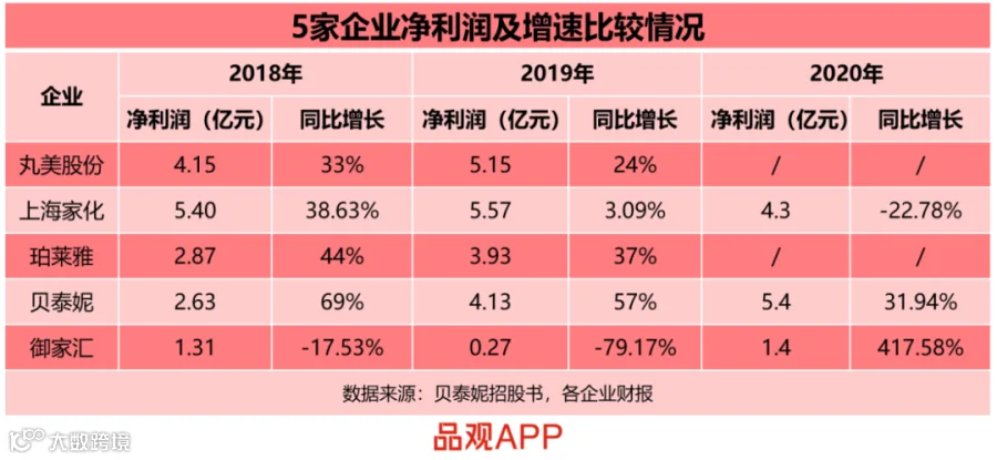 从净利润来看,2020年,贝泰妮的净利润超过上海家化以及御家汇。同时,贝泰妮的净利润增速仍然保持领先,2018年及2019年增速均超过50%。