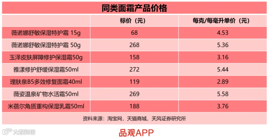 以“舒敏保湿特护霜”为例,目前,市面上面霜类产品普遍容量为50ml(或50g),而薇诺娜推出15g和50g两款包装。由于商品容量较小,所以标价远低于其他品牌的产品,15g容量在天猫旗舰店正价仅68元,除了在价格上更占优势,小包装便于携带的特点也有助于延伸使用场景。此外,该单品5.36元/g的价格,虽与薇姿、雅漾等相近,但明显高于玉泽、理肤泉等品牌,位居同类产品前列。