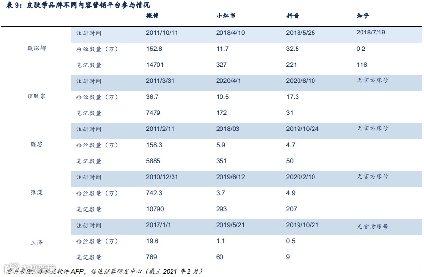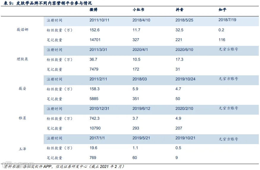 根据各大社交媒体官方号注册时间及粉丝沉淀,薇诺娜在小红书上粉丝数量与理肤泉相当,远高于雅漾、玉泽,笔记数量居第一;在抖音上的粉丝数量,也远高于同类品牌;在理肤泉、薇姿等众多品牌未曾涉及的知乎领域,薇诺娜已有2000+粉丝。