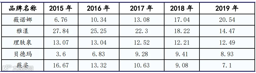 在薇诺娜诞生的2010年,皮肤学级护肤品市场曾迎来一波爆发。彼时,薇姿(1998年7月)、理肤泉(2001年11月)以及雅漾(2003年1月)等,已相继进入中国市场,并在市场掀起一阵风浪。2017年起,薇诺娜超越薇姿、理肤泉,以13.08%的市占率排名第二;而到了2019年,薇诺娜超越雅漾,以20.54%的市占率排名第一。
