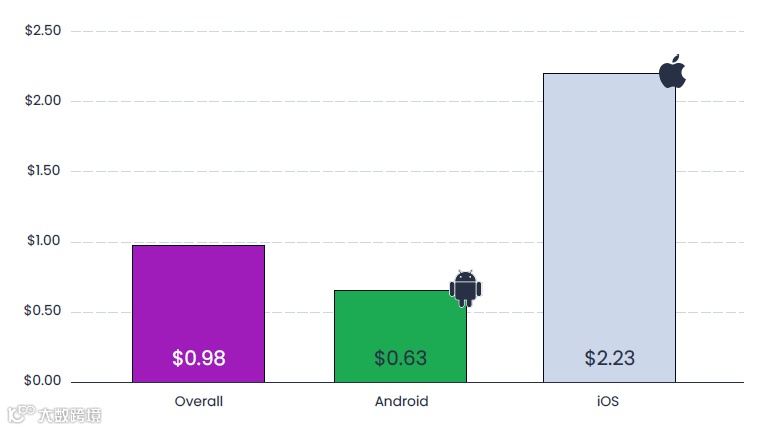 在为休闲手机游戏选择广告投放平台时,你需要注意以下几点:自ATT实施后,Android平台上的广告成本效益显著提高,CPI仅为0.63美元,相比之下,iOS平台的每次安装成本则较高,达到2.23美元。