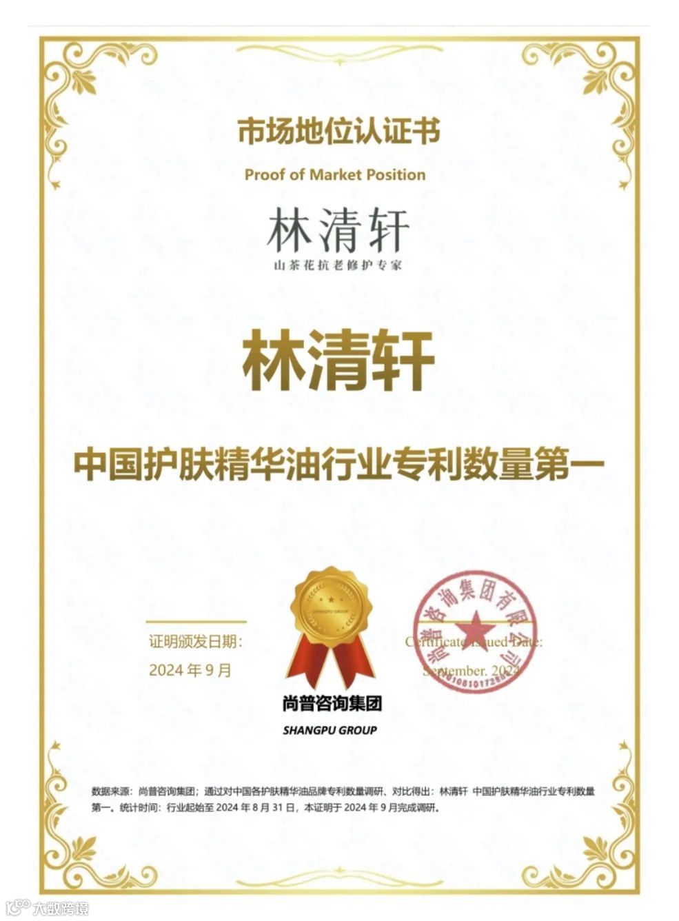 鉴于林清轩的研发投入和技术实力,国际权威咨询公司尚普咨询集团授予林清轩“中国护肤精华油行业专利数量第一”市场地位认证,高度肯定了林清轩在护肤行业的科研实力。