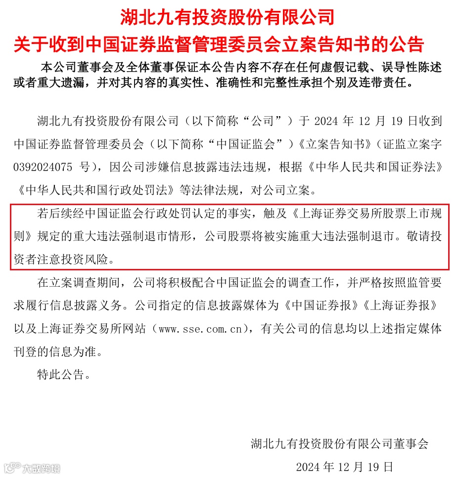 近日,湖北九有投资股份有限公司(以下简称“九有股份”)发布公告称,其于2024年12月19日收到中国证监会《立案告知书》(证监立案字0392024075号),原因系公司涉嫌信息披露违法违规。