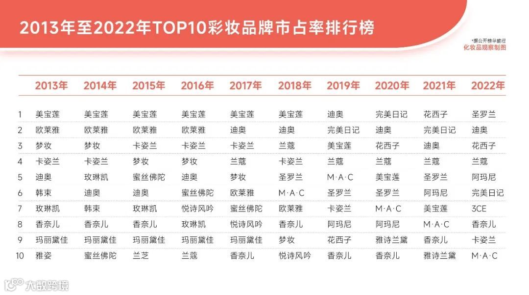 事实上,毛戈平自诞生到成为头部的20多年来,彩妆行业已发生了翻天覆地的变化。透过近10年中国市场彩妆品牌市占率TOP10变化,可以看到国货彩妆的变迁。