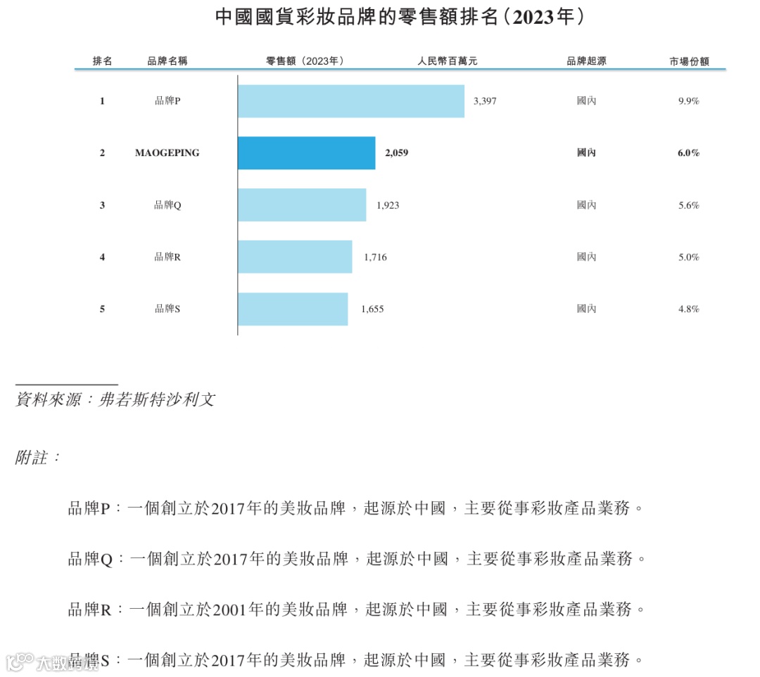 其中,MAOGEPING不仅是中国第二大国货彩妆品牌,亦是最大的国货彩妆品牌(按2023年线下渠道——尤其是百货商店部分,产生的零售额计算)。