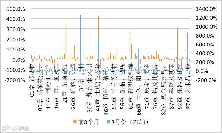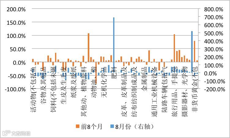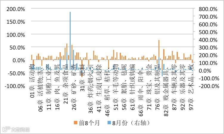 据统计,今年8月份,美国按SITC二级分类的66类出口商品中,有33类商品对华出口累计同比下降1%~95%,其中跌幅超过20%的有22类商品(见图7);而中国按HS分类的98类出口商品中,有18类商品对美出口累计同比下降2%~80%,其中跌幅超过20%的仅有5类商品(见图9)。
