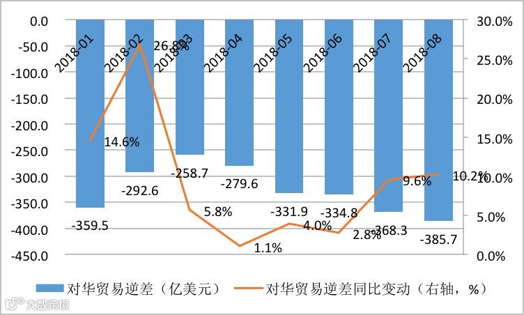 从美方统计看,今年前8个月,美国的贸易逆差5739亿美元,同比增长8.4%,其中对华贸易逆差2611亿美元,同比增长9.0%,这贡献了同期美国贸易逆差增幅的48.1%;美国对华贸易逆差占美国贸易总逆差的45.5%,占比较上年同期上升了0.2个百分点。自6月份贸易摩擦全面升级以来,6~8月份,美国对华贸易逆差均维持了同比正增长,分别为增长2.8%、9.6%和10.2%;月度贸易逆差规模为年内前三位,分别为335亿、368亿和386亿美元(见图2),8月份更是创了对华贸易月度逆差规模的历史新高。