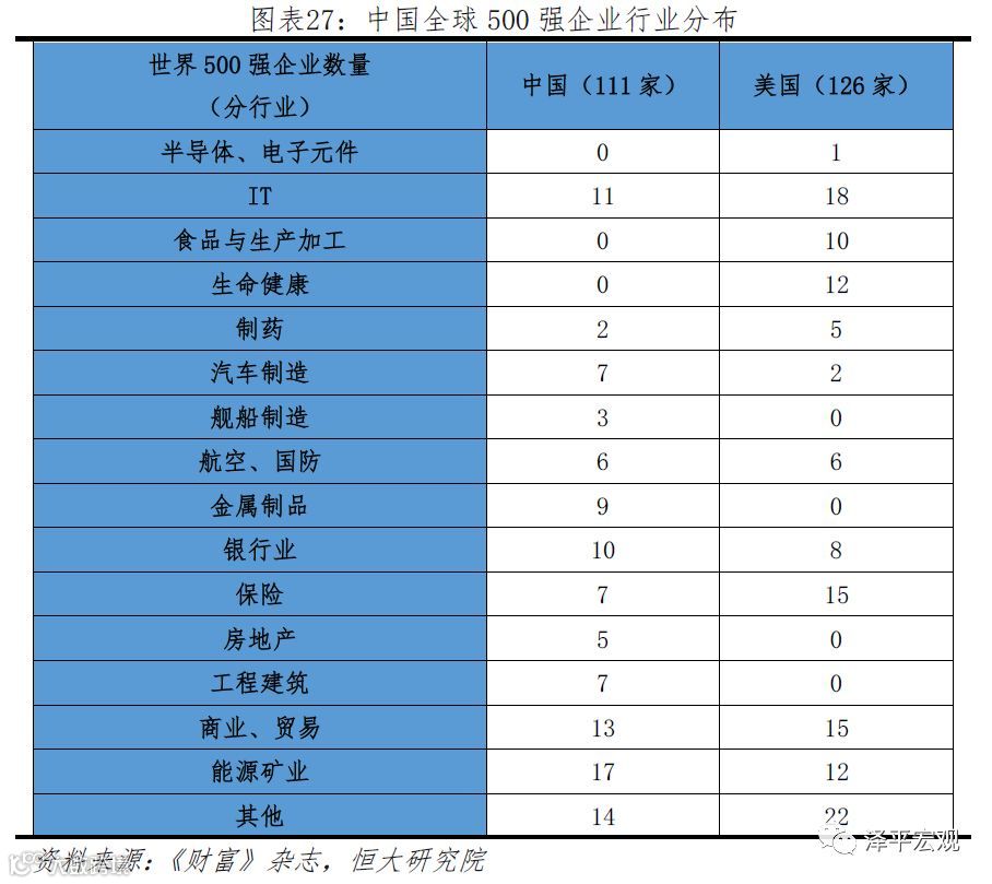 第六,中国进入世界500强的数量比美国少6家,但国企多民企少,集中在资源垄断性行业及金融部门,美国在生命健康领域上榜企业较多。