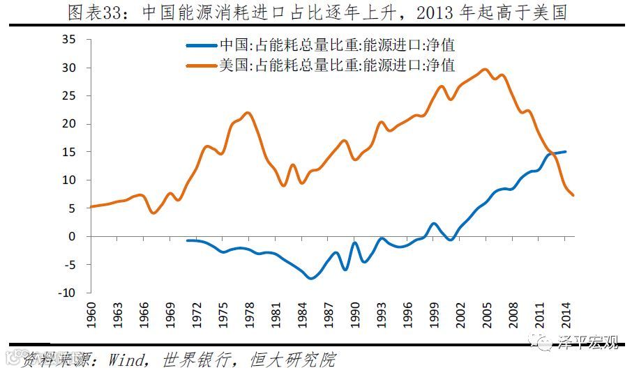 中国的钢铁产量约为美国的10倍,但中国的原油产量及自给率仅相当于美国的1/3和1/2。2017年中国、美国的钢铁产量分别为85007和8161万吨,中国是美国钢铁产量的10倍。2017年中国和美国的原油自给率分别是32.2%和65.5%,中国仅为美国的一半;中国和美国的原油产量分别为1.9和5.7亿吨,中国是美国的1/3;中国和美国原油消费量分别为5.9和8.7亿吨,中国是美国的2/3;2013年中国页岩气藏量134万亿立方米,美国页岩气藏量131.5万亿立方米;中国技术可开采量32万亿立方米,美国为33万亿立方米。