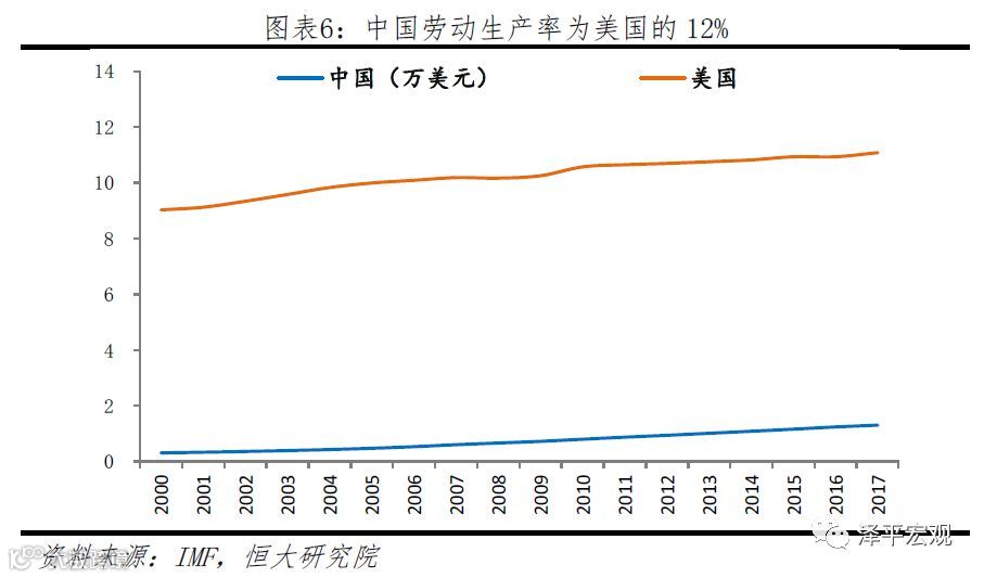 中国经济正从高速增长转为高质量增长阶段,更加依赖全要素生产率,但我国经济产出效率仍大幅低于美国。2014年中国全要素生产率(PPP计价)为美国的43%;2017年中国劳动生产率为1.3万美元,美国11万美元,中国约为美国12%。