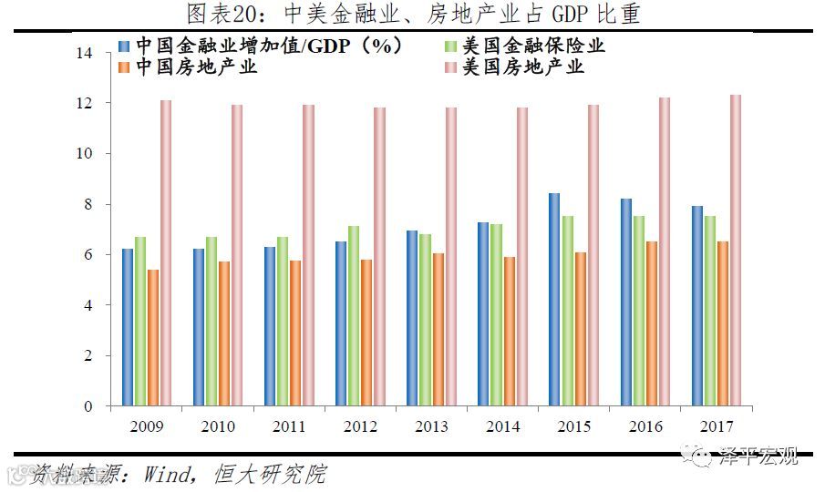 中国金融业占比略超过美国,房地产业占比约为美国的一半。2017年,中国金融业占GDP的7.9%;美国金融保险业占GDP的7.5%。中国、美国的房地产与租赁业占GDP比重分别为9%和13.4%;其中,中国、美国房地产业占GDP的比重分别为6.5%和12.3%。