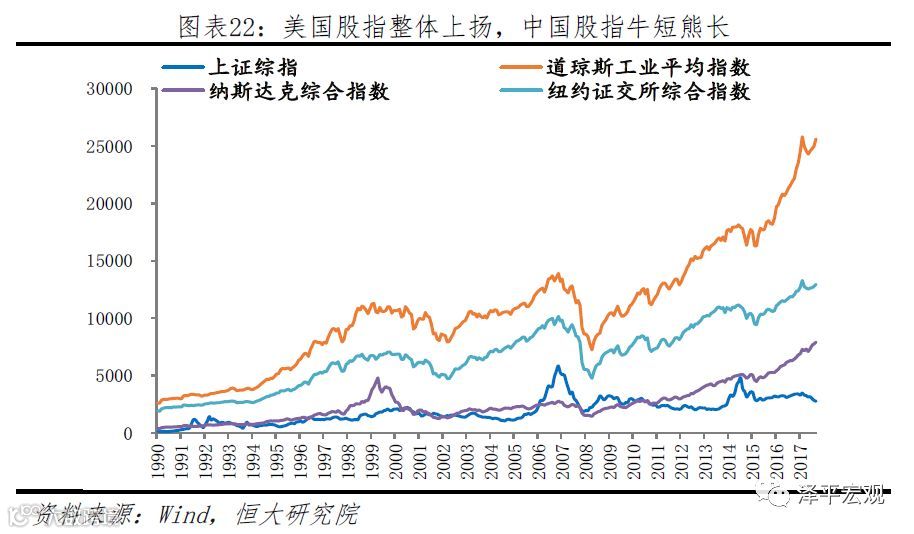 中国股票市场发展较晚,沪深两市总市值仅占美股的1/5。2017底A股总市值为8.7万亿美元,占GDP比重为71.2%;美股总市值已达42.6万亿美元,占GDP比重为165.7%。沪深两市上市公司共3485家,美股上市公司总数4773家。从股票发行与退市制度看,中国实行IPO审批制,公司上市程序复杂、用时较长,市场机制作用不能充分发挥;美国实行注册制,通过发行人和投资者的价格博弈可充分发挥市场机制作用。从投资结构看,中国股市由个人投资者主导,中小投资者(证券账户资产量低于50万元)占比75.1%,羊群效应和非理性特征明显;美国股市由机构投资者主导,侧重长期价值投资。从股指行情看,A股表现出牛短熊长特征,上证综指在经过几轮暴涨暴跌后长期趋势并不明显;美国表现出“慢牛行情”,长期呈上涨趋势,世界银行数据显示,2017年中国股市换手率为197%,美国股市换手率为116%。分行业看,中国各行业市值均低于美国,但材料、工业、房地产和金融行业相对市值较高,电信业务市值与美国差距较大。
