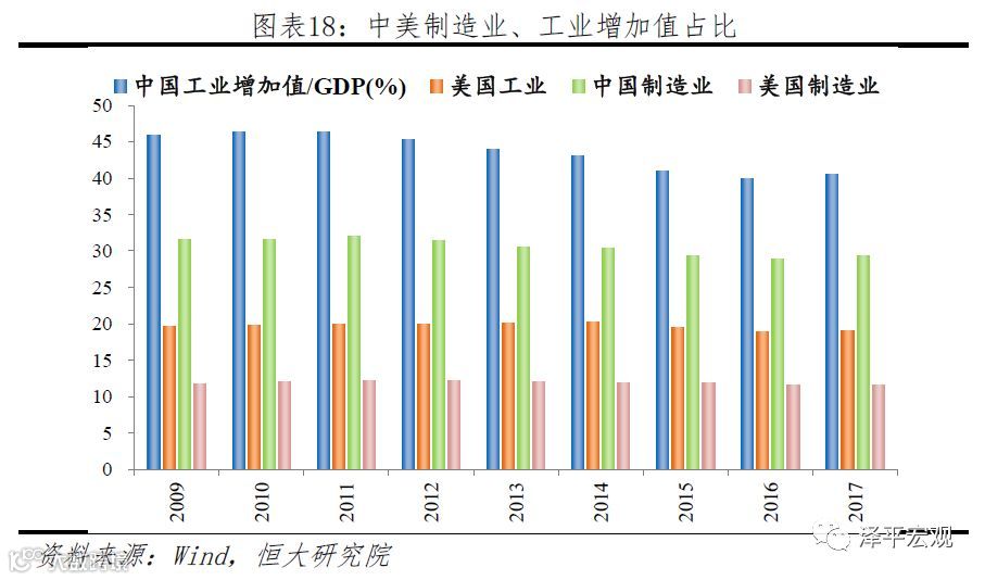 中国制造业占GDP和出口的比重均大幅高于美国,但中国高端服务业出口占比低于美国。2017年,中国工业增加值为41452亿美元,占GDP的33.8%,制造业增加值为35932亿美元,占GDP的29.3%;美国工业增加值28692亿美元,占GDP的14.8%,制造业增加值为22443亿美元,占GDP的11.6%。2015年中国制成品出口占商品出口比重为94.32%,高于美国20个百分点,高端服务(含旅游、知识产权、金融保险和通信信息服务)出口占比为34.6%,比美国低近30个百分点。