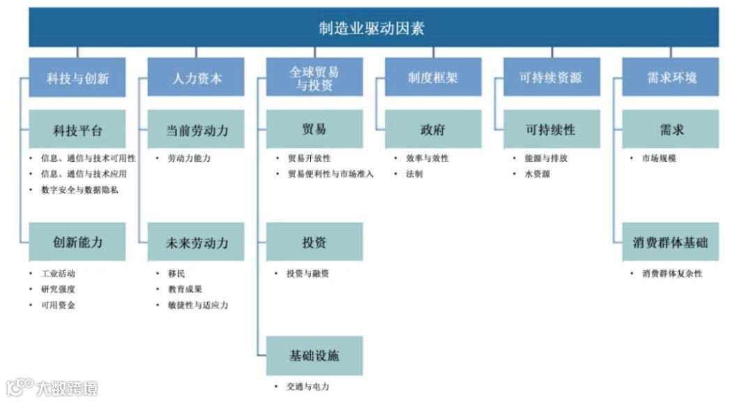 其次,是制造业驱动因素(如下图)。在当下的制造业发展大环境中,科技与创新、人力资本、全球贸易与投资、制度框架尤为重要。