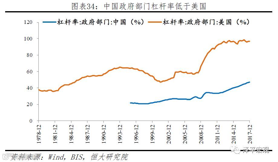 2015年中国的全口径宏观税负为33.9%,略高于美国的33%。中国的财政赤字率和政府债务率低于美国,但是隐性债务较多,中国的社会保障和基础设施建设水平仍低于美国。2017年中国财政赤字率为2.9%(目标赤字率3%),低于美国的3.5%。根据BIS数据,中国政府的杠杆率为47%,低于美国的97%。