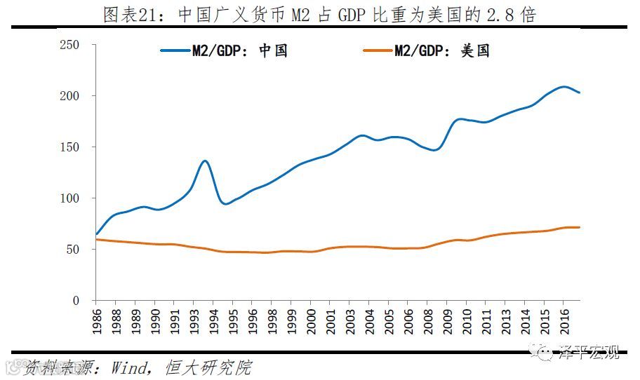 中国M2/GDP比重为美国的2.8倍,货币大量超发。2017年底中国货币供应量(M2)为24.8万亿美元,占GDP比重202.8%;美国货币供应量为14万亿美元,占GDP比重71.4%。