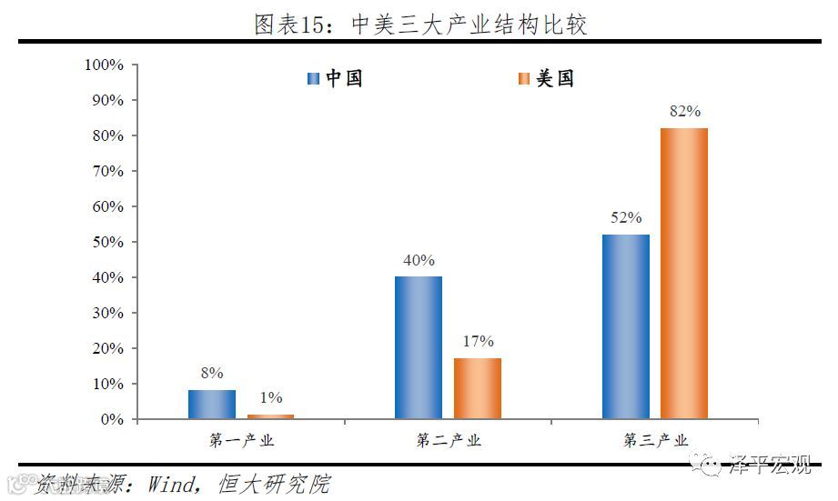 中国第三产业占比低于美国30个百分点,美国服务业占绝对主导。2017年我国三大产业占GDP的比重分别为8%、40%和52%,美国三大产业占GDP比为1%、17%和82%。从劳动力分布看,2017年中国三大产业就业人数占比为27%、28.1%和44.9%;美国三大产业就业人数占比为1.7%、18.9%和79.4%。