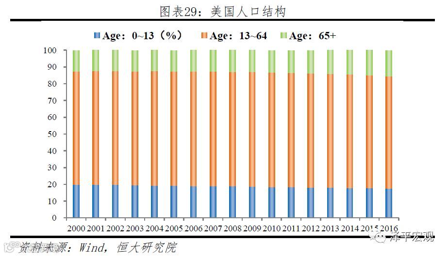 中国人口总量为美国的4.3倍,老龄化率比美国低,但增速较快。2017年末我国总人口为13.9亿,美国为3.2亿,中国约为美国的4倍;中国人口密度为每平方公里145人,美国为36人,中国约为美国的4倍;中国人口老龄化率为11.39%,美国为15.41%,但我国老龄化率的增速快于美国,过去十年中国人口老龄化率增速0.3个百分点/年,美国人口老龄化率增速为0.28个百分点/年;中美两国的男女比例为1.05和0.97。