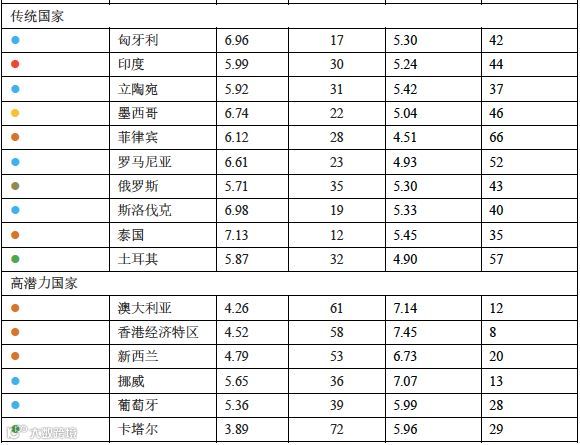 高潜力国家:目前制造业基础有限,在制造业驱动因素方面得分较高,表明其存在制造业发展潜力,但取决于国民经济优先发展次序。(7个,如澳大利亚、挪威、新西兰等)