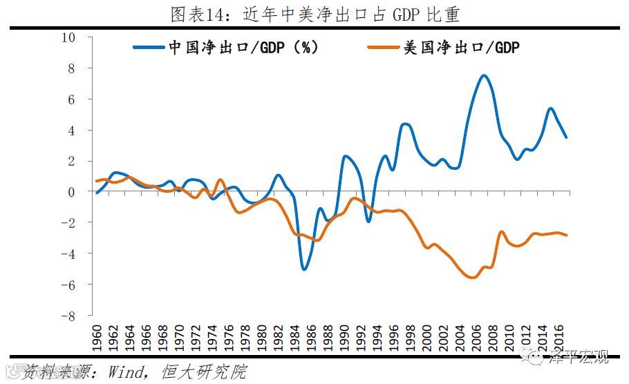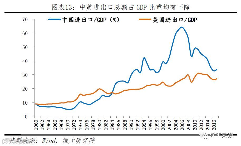 中美两国对进出口的依存度均有下降,中国下降幅度更大。中国进出口总额/GDP自1978年尤其是2000年加入WTO以来,快速提高,在2006年达到最高点64.2%,其后持续下降,2017年为33.6%,进出口依存度下降,较最高点下降了30多个百分点。中国货物贸易顺差整体持续扩大,净出口/GDP在2007年达到7.5%后下行,2017年为3.5%。美国进出口总额/GDP持续增加,到2011年达到最高点30.9%,近年来有所下降,2017年为27%。美国净出口在1971年首次转负后,除80年代末因日美贸易战而有所缓和外,大部分年份均为负数,在2006年净出口/GDP达到-5.5%,其后逆差缩窄,2017年为-2.8%。中美贸易战并未爆发在美国逆差最严重的2006年前后,而在缩窄的2018年,可见缩减贸易逆差只是美方发起贸易战的借口。