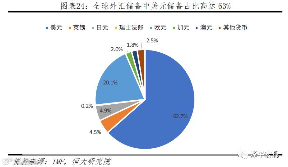 美元为国际储备货币,在全球外汇储备中占比高达63%,人民币占比仅为1.2%。2017年中国IMF投票权份额6.41%,美国为17.46%,具有一票否决权。2017年底中国外汇储备为30667亿美元,美国外汇储备为1233亿美元,中国为全球第一大外汇储备国,占比约25%。2017年全球外汇储备中,美元占比62.7%,人民币占比为1.22%,欧元占比20.1%,日元占比4.9%,英镑占比4.5%,加元占比2%。