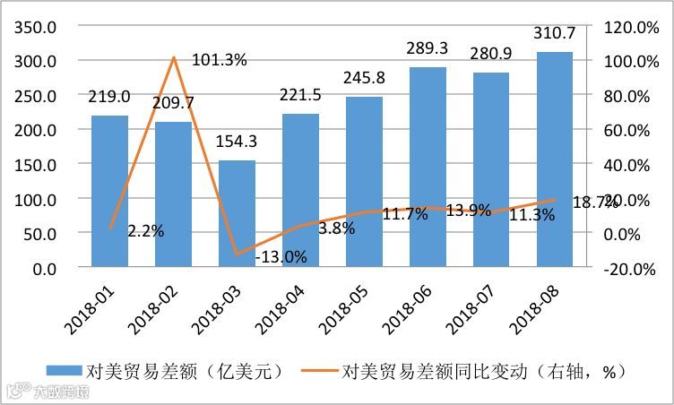 从中方统计看,今年前8个月,中国的贸易顺差1697亿美元,同比下降26.4%,但对美贸易顺差1931亿美元,同比增加13.8%,中国对美贸易顺差占中国贸易总顺差的99.7%%,占比较上年同期上升了35.2个百分点。尤其是自6月份中美贸易冲突正式爆发以来,6~8月份,中国对美贸易顺差均维持了两位数的同比正增长,分别为增长13.9%、11.3%和18.7%,同期月度贸易顺差规模为年内前三位,分别为289亿、281亿和311亿美元(见图1),8月份更是创了对美贸易月度顺差规模的历史新高。