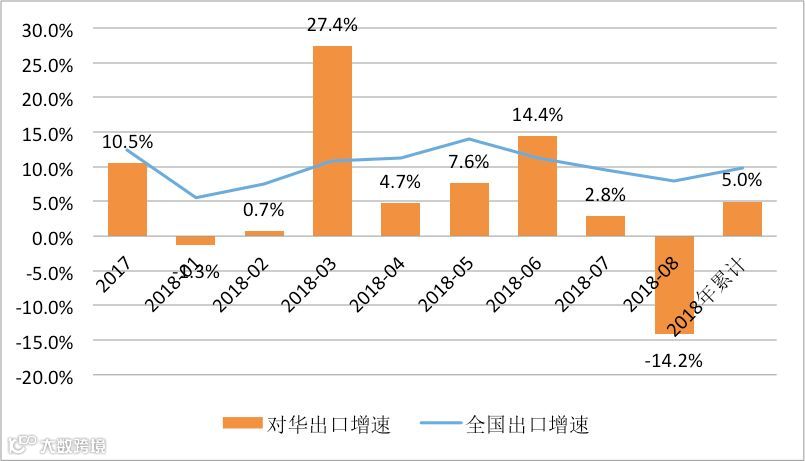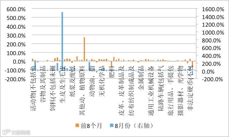 随着首批500亿美元商品加征关税的措施逐步落地,且中美贸易争端愈演愈烈,对美输华产品的影响面扩大,冲击也进一步加深。例如,8月份,美国煤、焦炭及煤砖出口同比下降82%;石油、石油产品及有关原料出口下降83%;陆路车辆(包括气垫式)出口下降46%;办公用机械及自动数据处理设备出口下降30%……。