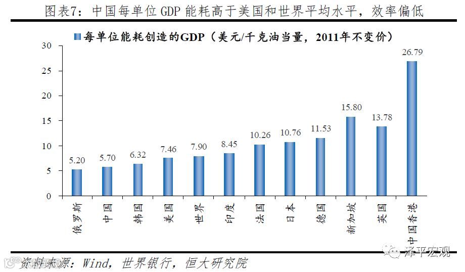 中国GDP的创造效率低于美国和世界平均水平,能耗大,在主要大国中仅好于俄罗斯。2014年,我国每单位能耗创造的GDP为5.7美元/千克油当量,美国为7.46美元/千克油当量,世界平均水平为7.9美元/千克油当量。