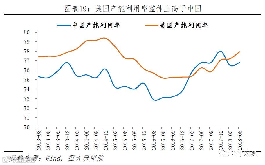 中国工业产能利用率整体低于美国,2017年因国内去产能而略高于美国。2013年以来,中国工业产能利用率整体上低于美国,但去产能取得进展,2017年产能利用率达到76.85%,高于美国的76.12%。其中,煤炭、油和天然气开采业,中国为79.6%,美国为78.42%;黑色金属冶炼加工,中国为77.7%(有色金属冶炼及加工79.4%),美国为77.41%;汽车制造业,中国为81.05%,美国为77.68%;电器机械和器材制造业,中国为78.3%,美国为72.69%;通信和其他电子设备,中国为78.25%,美国为70.15%。
