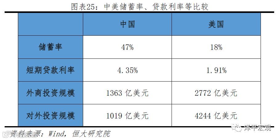 中国总储蓄率高于美国,但美国贷款利率低于中国,吸引外商投资规模高于中国。2016年,中国总储蓄率47%;美国总储蓄率为18%。2018年7月,中国短期贷款利率4.35%,美国联邦基金利率1.91%。2017年,中国吸引外商直接投资1363亿美元,美国吸引外商直接投资2773亿美元。2017年中国对外投资1019亿美元,美国对外投资4244亿美元。