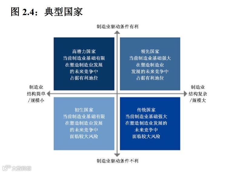 领先国家:目前拥有强大制造业基础,在制造业驱动因素方面表现强劲,对制造业的未来准备程度高。同时,领先国家面临未来冲击风险的经济价值最大。(25个,如美国、中国、日本、韩国等)