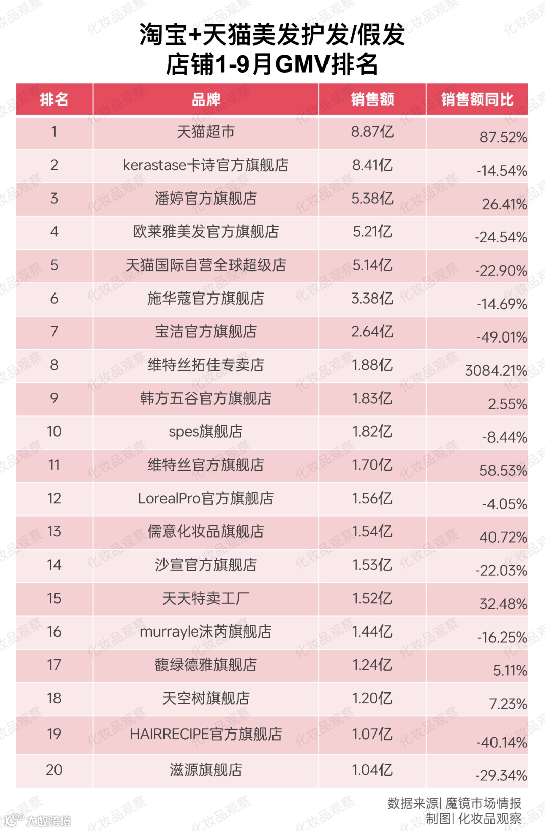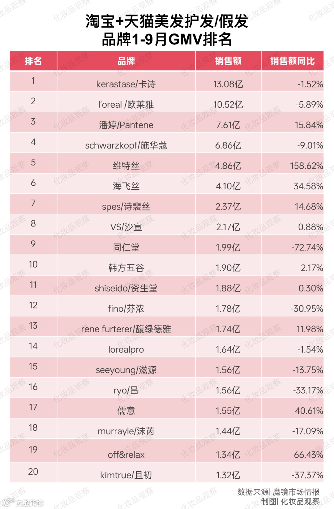 GMV超10亿元的品牌有卡诗、欧莱雅2个,均为欧莱雅集团旗下品牌。不过,目前这两大品牌均为同比负增长状态。