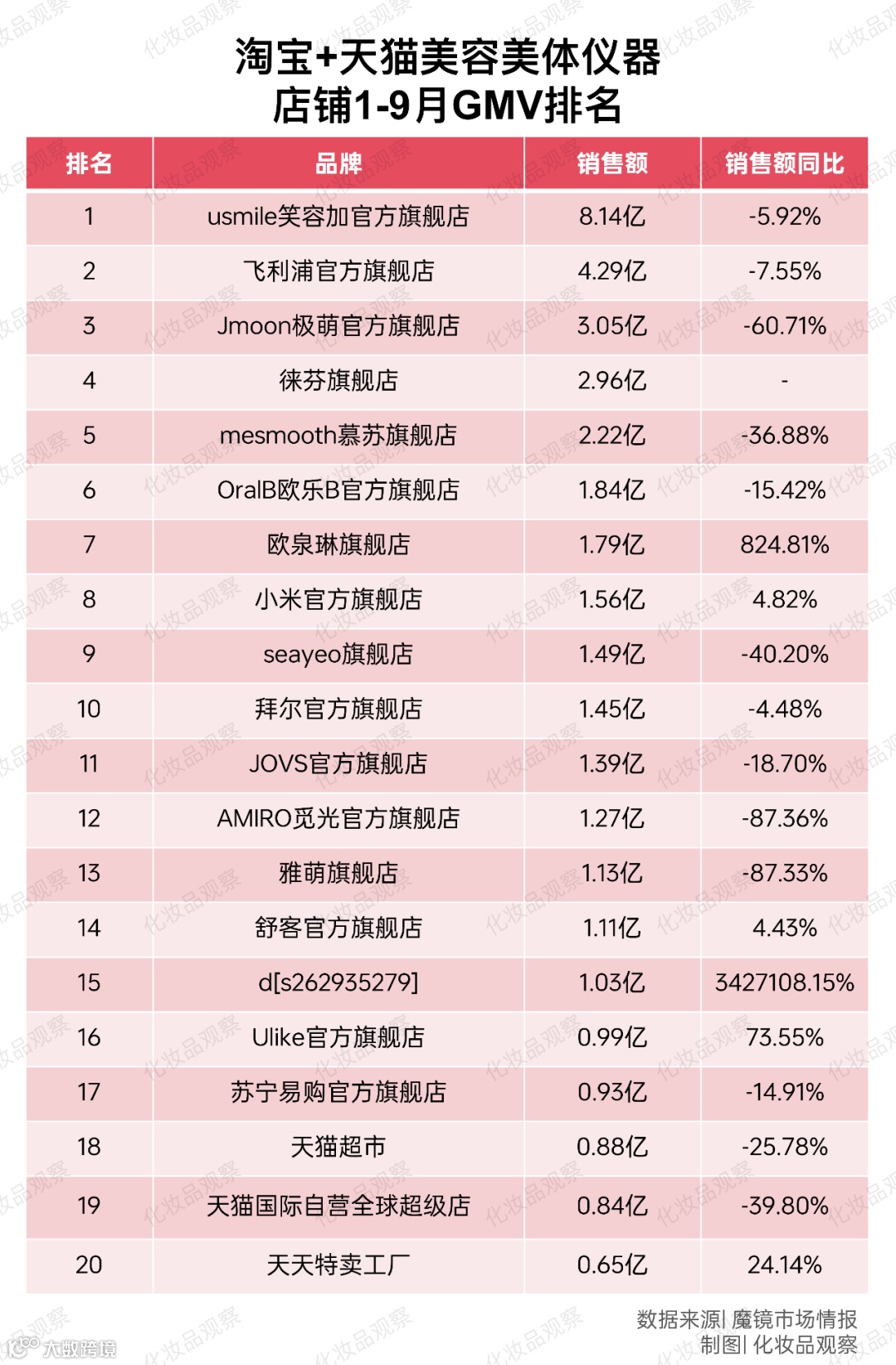 与品牌维度数据一样,侧重于个护美容仪器的品牌官方店铺,也均呈现了同比双位数下滑的趋势。