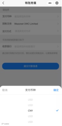 在网页端或小程序内点击钱包充值,进入充值到钱包余额页面,输入需要充值的币种,主体,可选择线上支付或银行转账支付,银行转账提交水单,财务会进行审核~