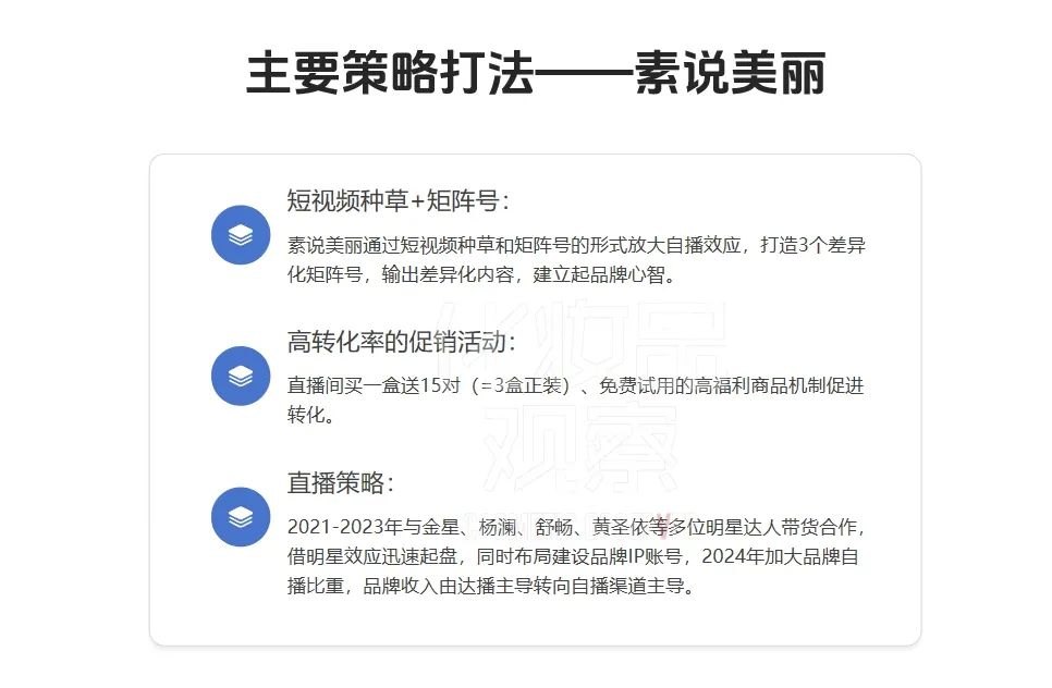 素说美丽曾于2021至2023年间,与金星、杨澜、舒畅、黄圣依等多位明星达人带货合作,借明星效应迅速起盘,同时布局建设品牌IP账号,2024年加大品牌自播比重,品牌收入由达播主导转向自播渠道主导。