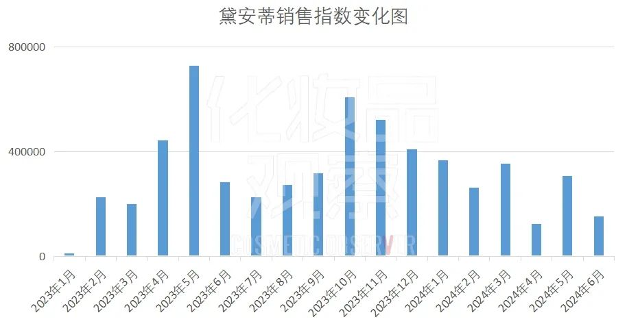 黛安蒂便是其中之一。黛安蒂于2023年2月起量,同年5月达至巅峰,跻身抖音美妆月榜TOP3,而后有所回落;不过,它很快于2023年10月迅速回升,跑进抖音美妆月榜TOP7。2023年度,其GMV一度超过13亿元。从数据表现来看,今年以来,黛安蒂的势头虽有所回落,但整体花期已持续1年时间。