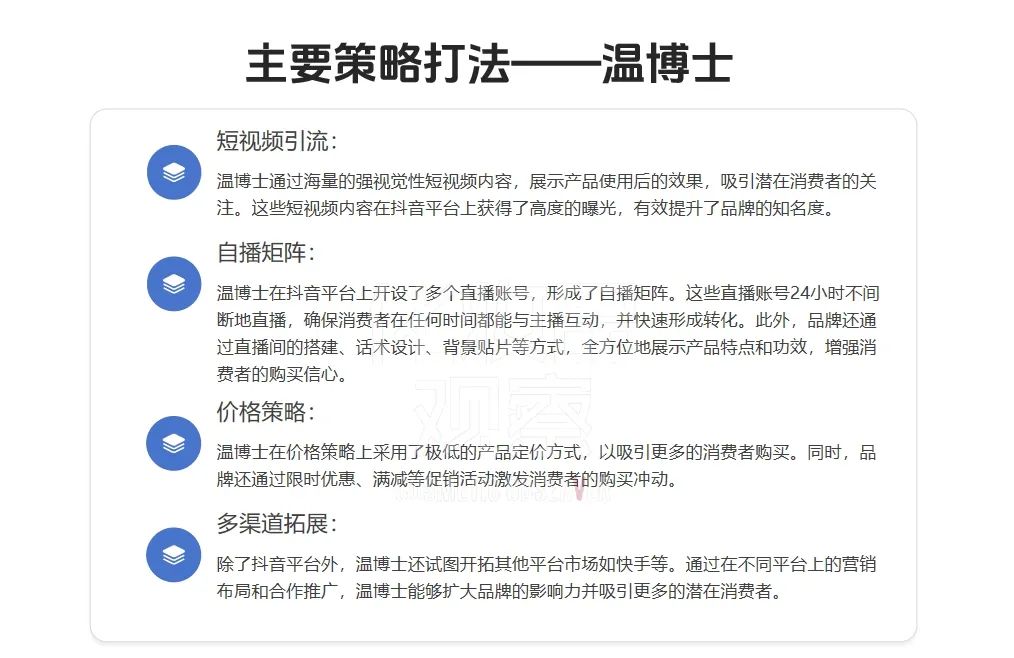 温博士在抖音平台上开设了多个直播账号,如温博士护肤旗舰店、温博士个人护理旗舰店、温博士之护肤专卖店等,形成自播矩阵。这些直播账号24小时不间断地直播,确保消费者在任何时间都能与主播互动,并快速形成转化。此外,品牌还通过直播间的搭建、话术设计、背景贴片等方式,全方位地展示产品特点和功效,增强消费者的购买信心。