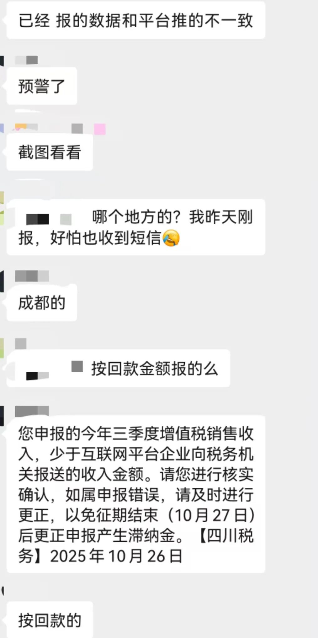 10月26日下午,四川、浙江、福建等部分卖家在社群反馈,收到了当地税务部门发送的税务预警短信。短信内容大致如下: