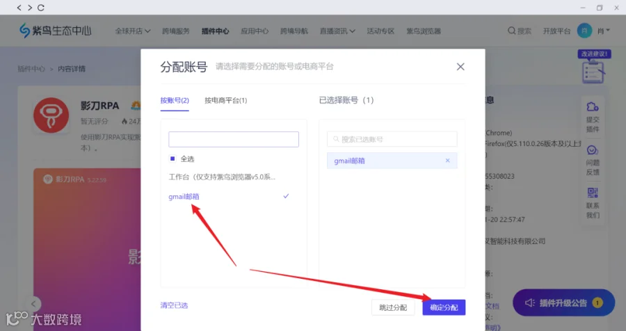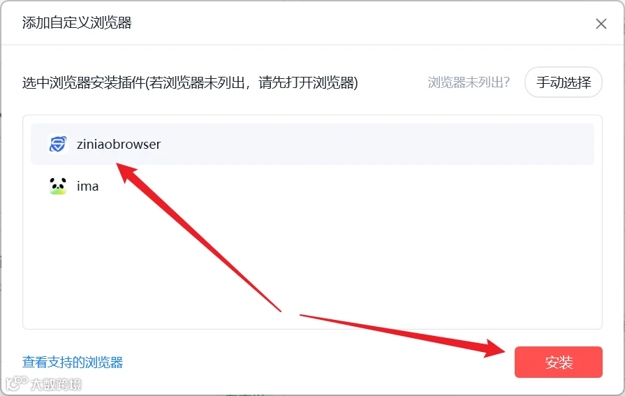 3、点击「ziniaobrowser」和「安装」(不要关闭紫鸟浏览器,影刀会自动搜索需要添加插件的浏览器)