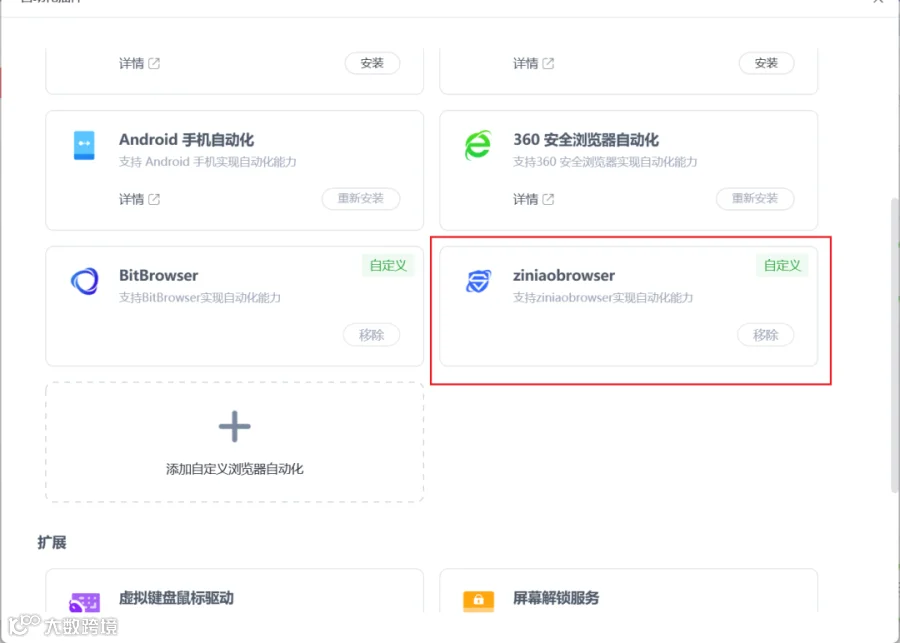 4、可以看到影刀上的紫鸟浏览器自动化插件已经安装好了
