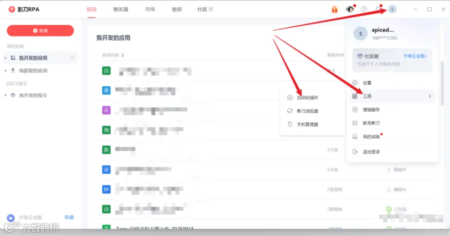 1、打开影刀客户端后,依次点击「用户中心」、「工具」、「自动化插件」
