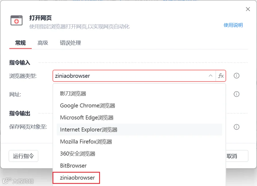 5、在「打开网页」这个指令的浏览器类型中出现了「ziniaobrower」的选项,说明能正常使用了