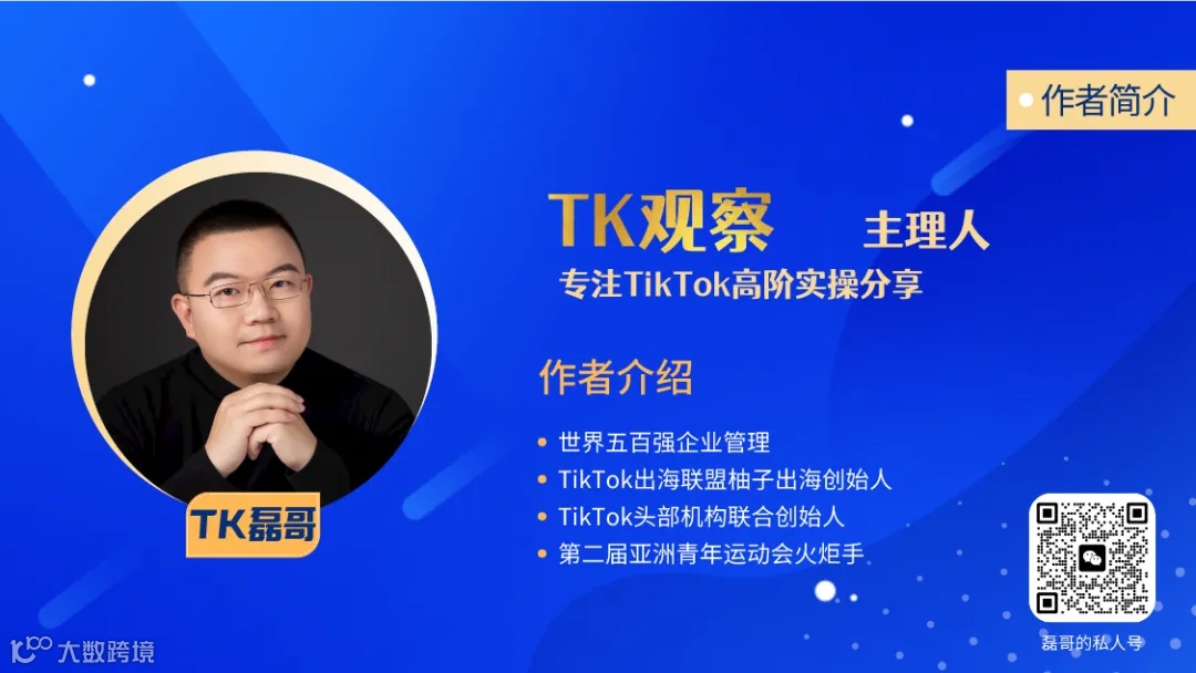 大家好,我是TK磊哥,曾在国内多家知名电商公司操盘数亿级体量行业,在线上与线下、会员与营销、品牌与工厂、直播与矩阵、平台与渠道等方面,都略懂一二。2021年开始进入TK行业,目前公司是2023年官方头部服务商之一,公司签约合作达人300+。想在这里和大家聊聊,分享一些我的见解,希望对大家有帮助,如果觉得说得中肯,有些价值,欢迎关注或添加youzichuhai合作交流,如果觉得没有价值,划走就好。