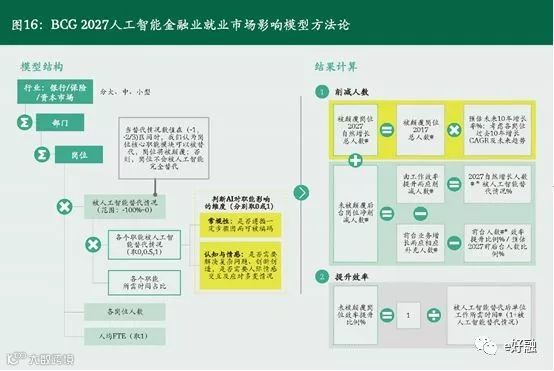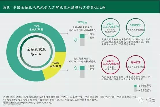 以2017年为中国AI应用元年,波士顿咨询(BCG)测算,到2027年,中国金融业就业人口预计达993万人。其中,23%(约230万人)的岗位将受AI颠覆性影响,被削减或转型;剩余77%的岗位虽未被替代,但效率大幅提升[k]。
